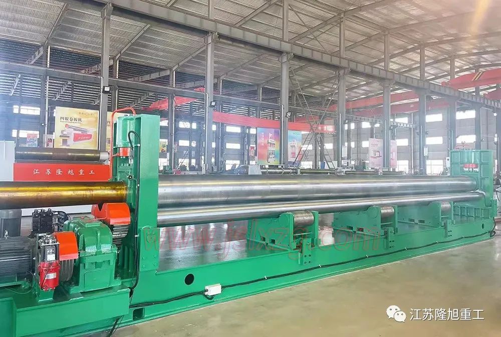 該卷板機屬于液壓型三輥卷板機,上輥可以通過液壓傳動垂直升降。下輥由電機、減速機帶動進行卷圓。由于下輥的標高不變,所以便于進料和操作。設備采用PLC可編程顯示器控制,運行平穩、靈活,無卡阻。該設備輥面還采用了鍍鉻工藝,更適合卷制不銹鋼罐體。